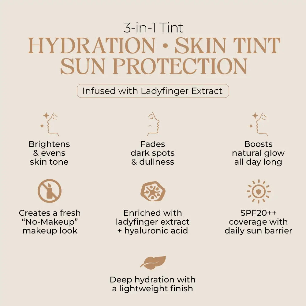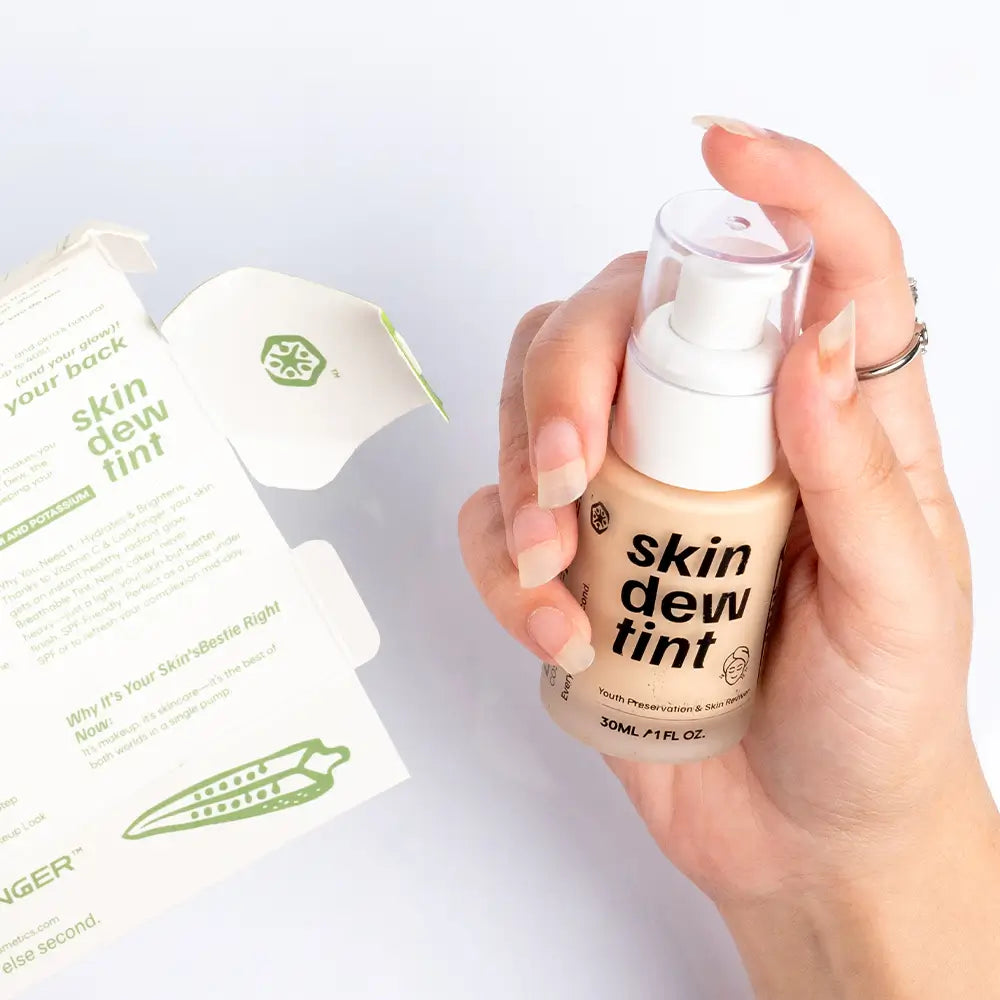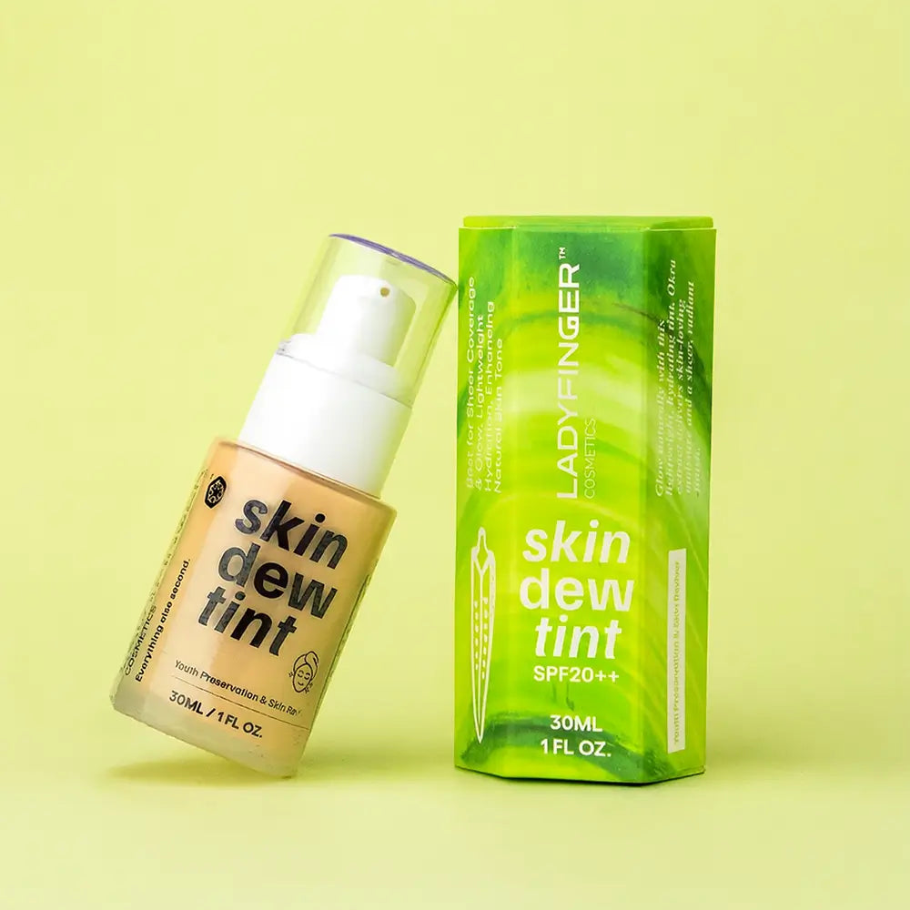 Skin Dew Tint is a lightweight, hydrating skin tint that delivers a smooth, dewy finish while providing sheer, natural-looking coverage and SPF 20+ sun protection. Infused with skin-loving ingredients like glycerin, ladyfinger extract, and titanium dioxide, it deeply moisturizes, brightens the complexion, and evens out skin tone while blurring imperfections and reducing redness.