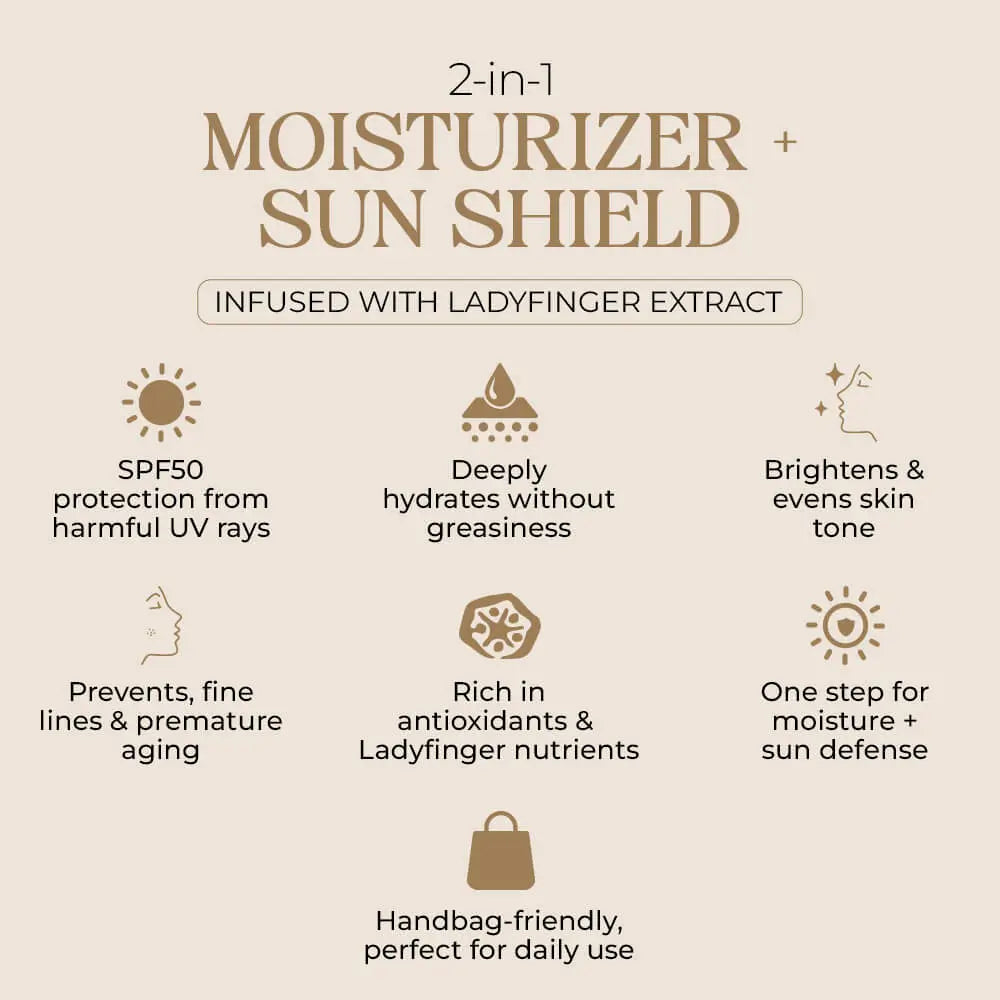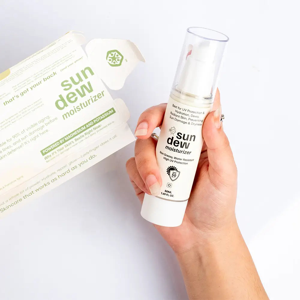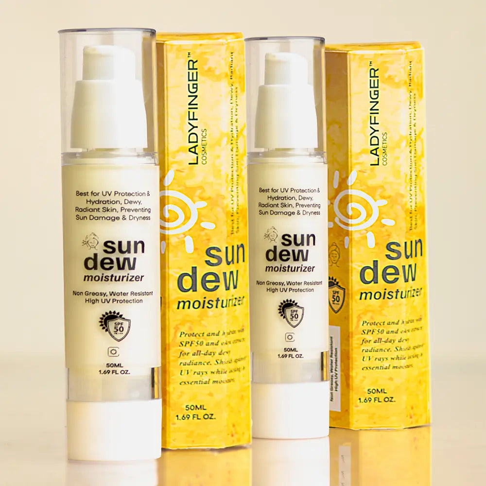 Sun Dew Moisturizer SPF by Ladyfinger Cosmetics is a lightweight, hydrating sunscreen that delivers broad-spectrum SPF 50 protection while deeply nourishing the skin with vitamin E and okra extract.